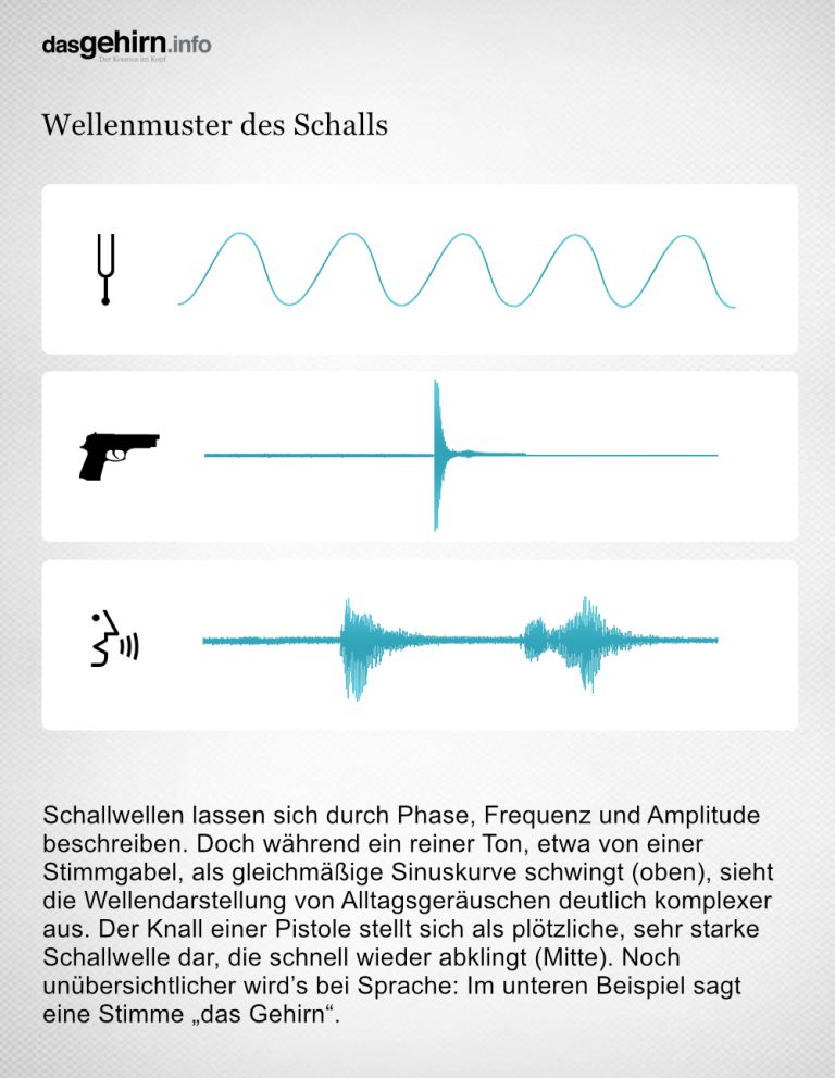 Wie erstaunlich diese Fähigkeit ist, mag jeder ermessen, der schon einmal die Gelegenheit hatte, Audiodateien in Wellenformdarstellung auf dem Computerbildschirm zu betrachten: Ein scheinbar chaotisches Auf und Ab. Denn während wie eine einfache Sinusschwingung als reiner Ton wahrnehmen, überlagern sich die Schallwellen realer Geräusche, etwa Sprache oder Musik, zu einem unübersichtlichen Durcheinander.