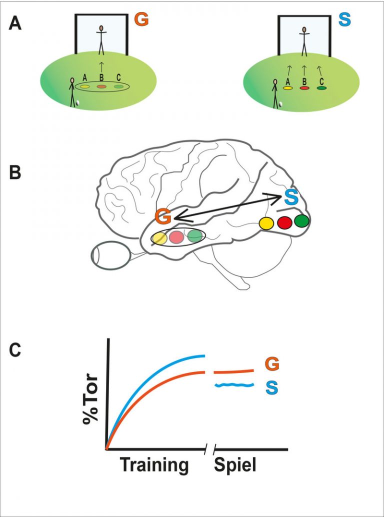 Die Forschenden legten ihrer Studie zwei Hypothesen zugrunde. Bei der Generalisierungsstrategie stützt sich das Lernen auf Neuronen, die unwichtige Reize ignorieren. Im Beispiel des Freistoßschützen verarbeiten sie also nur die Informationen zum Torschuss, nicht aber die verschiedenen Schusswinkel oder Entfernungen zum Tor. Diese Neuronen sitzen im Allgemeinen in höheren Stufen der sensorischen Verarbeitung. Bei der Spezialisierungsstrategie funktioniert das Lernen über Neuronen, die eng sowohl auf aufgabenrelevante als auch irrelevante Merkmale abgestimmt sind. Diese Neuronen können hochpräzise Informationen für die jeweilige Aufgabe liefern. Sie verarbeiten dabei jede Information separat. Die Aufgabenleistung ist dadurch sehr genau, es findet aber keine Generalisierung statt und bei jeder neuen Aufgabe werden neue, bislang untrainierte Neuronen benötigt, um die Reize zu verarbeiten. Spezialisierte Neuronen befinden sich in frühen Stufen der sensorischen Verarbeitung.