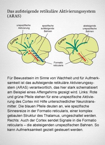 Die weitreichende Vernetzung ist essenziell, denn das ARAS beeinflusst den Aktivierungsstatus aller Hirnsysteme. „Seine Impulse bereiten das Gehirn für die Aufnahme und Verarbeitung neuer Information vor“, erklärt Singer. Die Aufmerksamkeit und die Weckfunktion werden vor allem über drei Transmittersysteme vermittelt: Noradrenalin, Acetylcholin und Serotonin. Noradrenalin und Acetylcholin aktivieren den Thalamus und damit die Aufnahmefähigkeit der Hirnrinde. Serotonin bremst den Informationsfluss. Damit ist das ARAS unabdingbar für jede Art der Wahrnehmung. Wird es zerstört, so fällt der Betroffene ins Koma.
