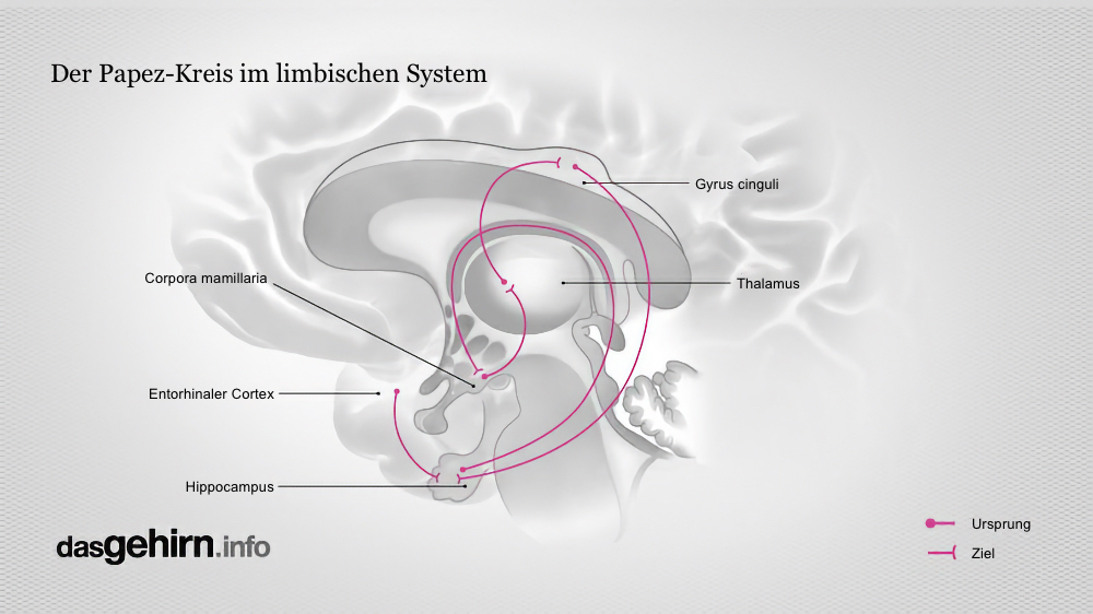 Was an frischer Erinnerung im Hippocampus lagert, wird über den Papez-Kreis gefestigt. Die Nervenbahnen, die an dieser Schleife beteiligt sind, ziehen vom Hippocampus über den Fornix zu den Mammillarkörpern, von dort zum Thalamus und über den Gyrus cinguli zurück zum Hippocampus.