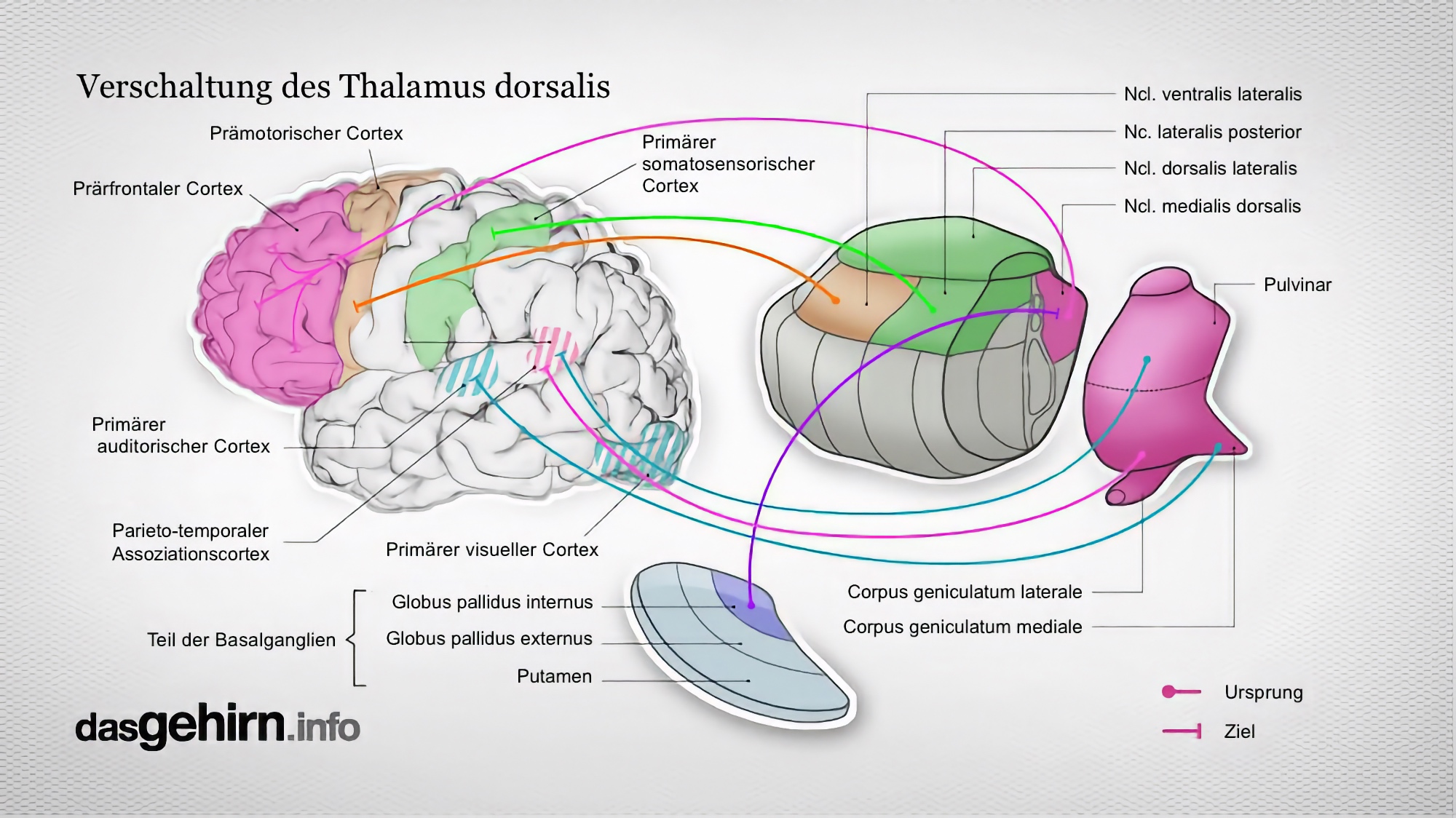 Der Thalamus moduliert die ein- und ausgehenden Informationen zwischen der Großhirnrinde und anderen Teilen des Zwischenhirns. Aus den wichtigsten Thalamuskernen laufen Verknüpfungen in den präfontalen, prämotorischen, somatosensorischen sowie den primären auditorischen und visuellen Cortex.