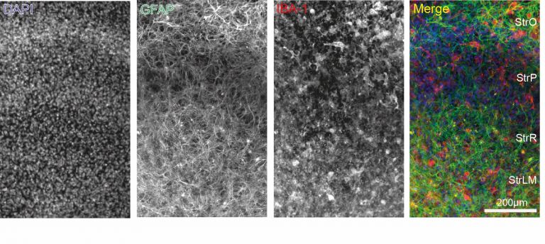 Das Gegenstück zu den On-Signalen sind Off-Signale. Sie sind erst da und irgendwann weg. „Wir glauben, dass Neurotransmitter hier eine wichtige Rolle spielen, um der Mikroglia zu sagen, dass ihre Umgebung in Ordnung ist“, sagt Kettenmann. Solange die Neurone normal weiter signalisieren, ist alles gut. In diesem Zustand sind die Mikroglia aber dennoch aktiv. Sie beeinflussen die synaptische Aktivität der Nervenzellen, bauen Rezeptoren aus den Neuronen aus oder ein und regulieren so deren Empfindlichkeit und Signalstärke. "Unter physiologischen Bedingungen sind sie an plastischen Vorgängen beteiligt und helfen über Komplementfaktoren bei Umbauprozessen von Synapsen mit.", wie Kettenmann betont.